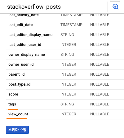 미리 public-data-set 의 stackoverflow dataset을 bigQuery table로 Import 했습니다.