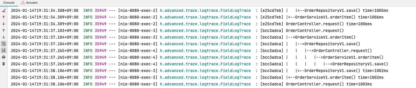 그러면 traceId 라는걸 파라미터로 넘기지 말고 필드로 동기화를 시켜보자. 이런 경우 개선할 수는 있지만 로컬에서 쓸때가 아닌 실제 상용에 배포를 하게 되면 동시성 문제가 발생하게 된다.