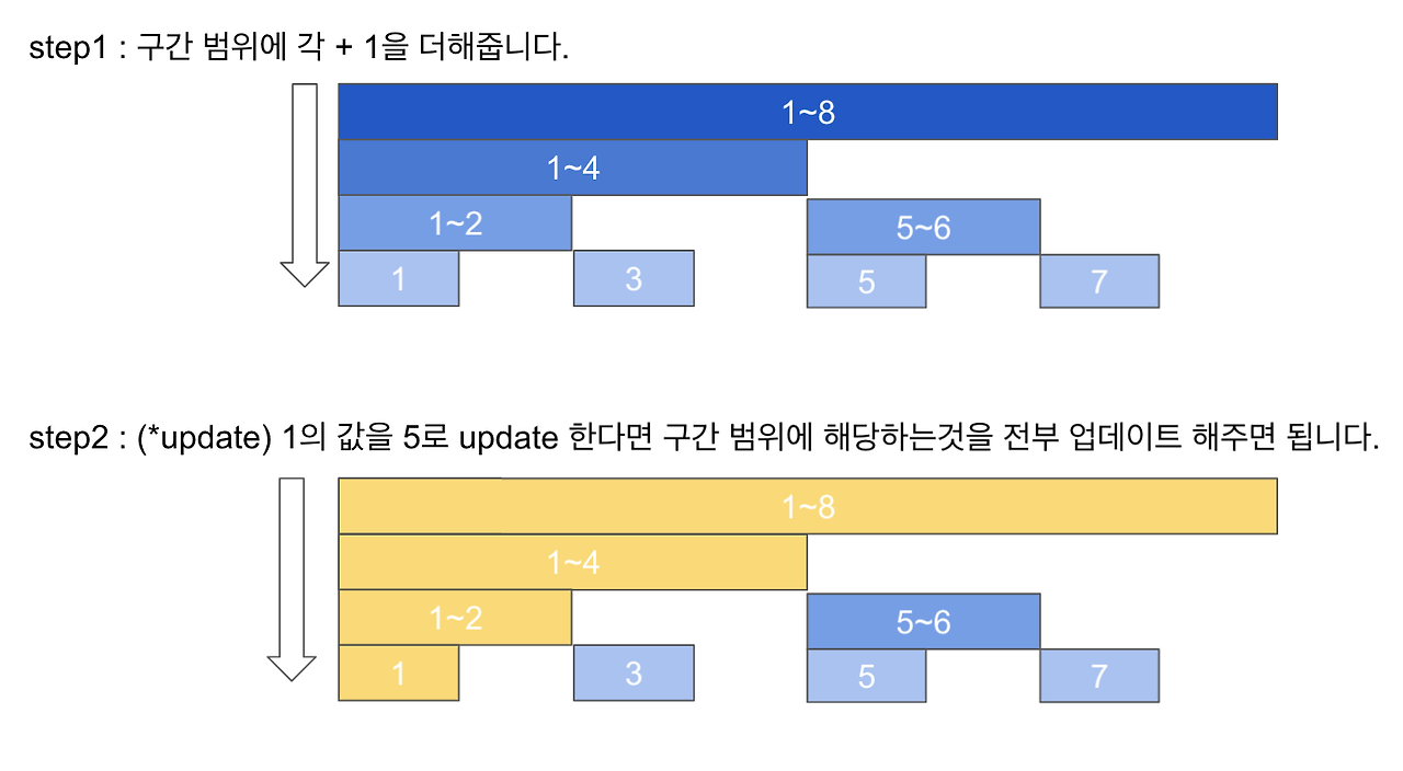 막대 구간에 update 해야할 숫자가 포함되어 있는 경우 노란색 막대가 그 예입니다.