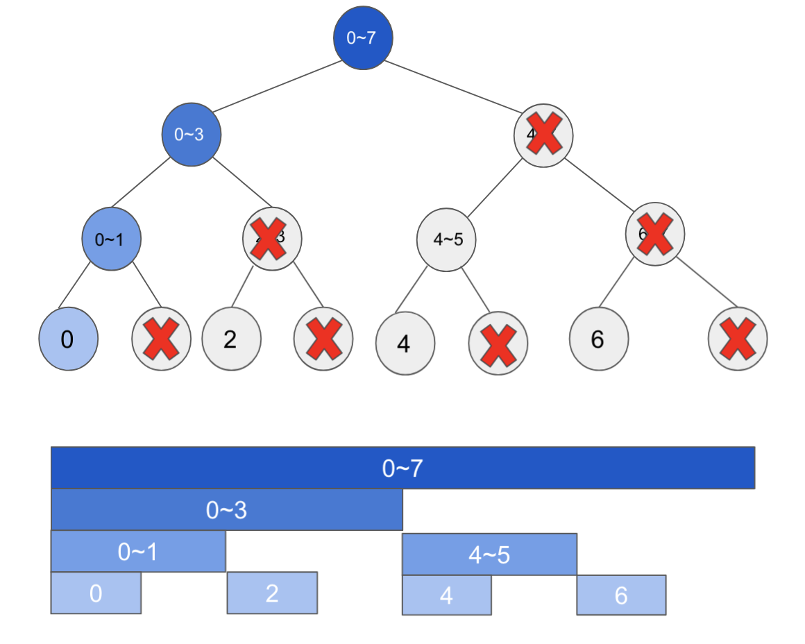 세그먼트 트리의 우측 구간을 줄이게 됩니다. 즉, 전체 노드의 1/2씩 줄이게 되는 구조를 가지게 됩니다.